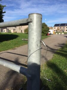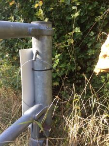 Ny låsanordning på grindarna. Sprinten tas bort för att öppna grindarna, och sätt tillbaks den när grinden stängs. Se bilderna
