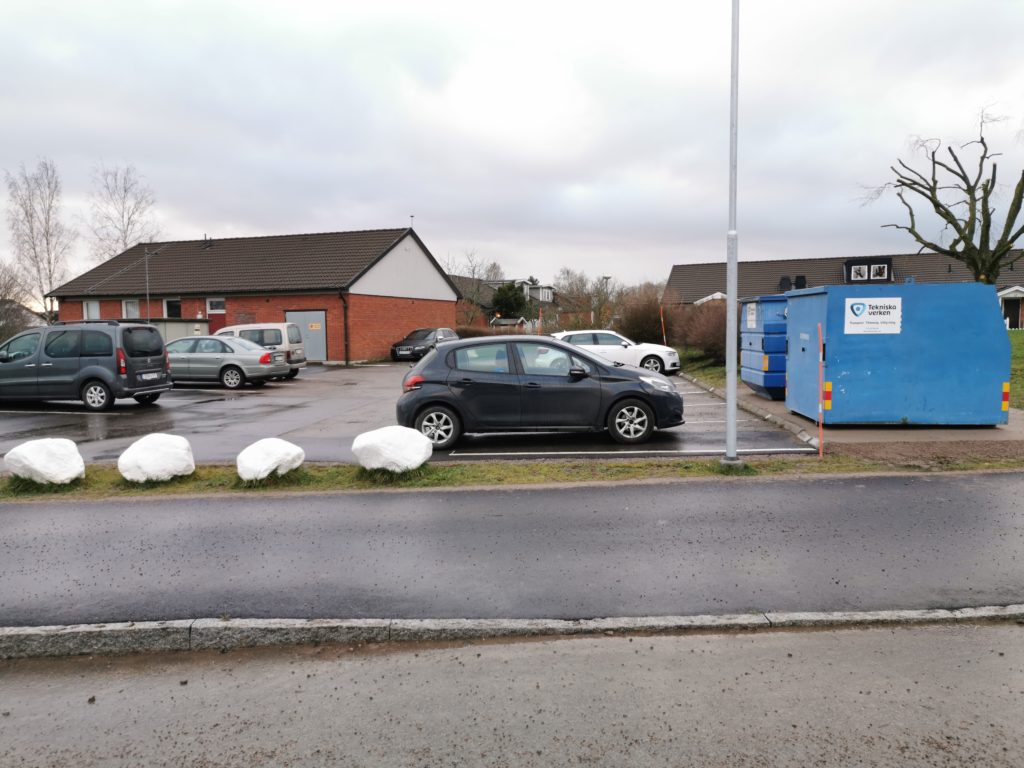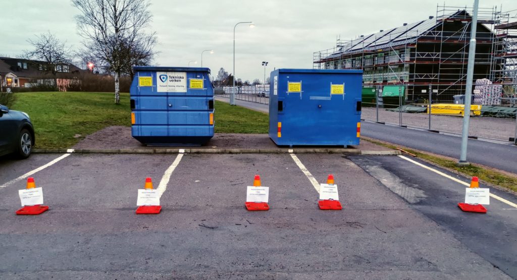 Det går att använda parkeringsplatserna framför containrarna förutom onsdagar och torsdagar mellan 7:00-17:00 då råder det parkeringsförbud framför dom. Om det står bilar framför så går det inte att tömma sopor…..